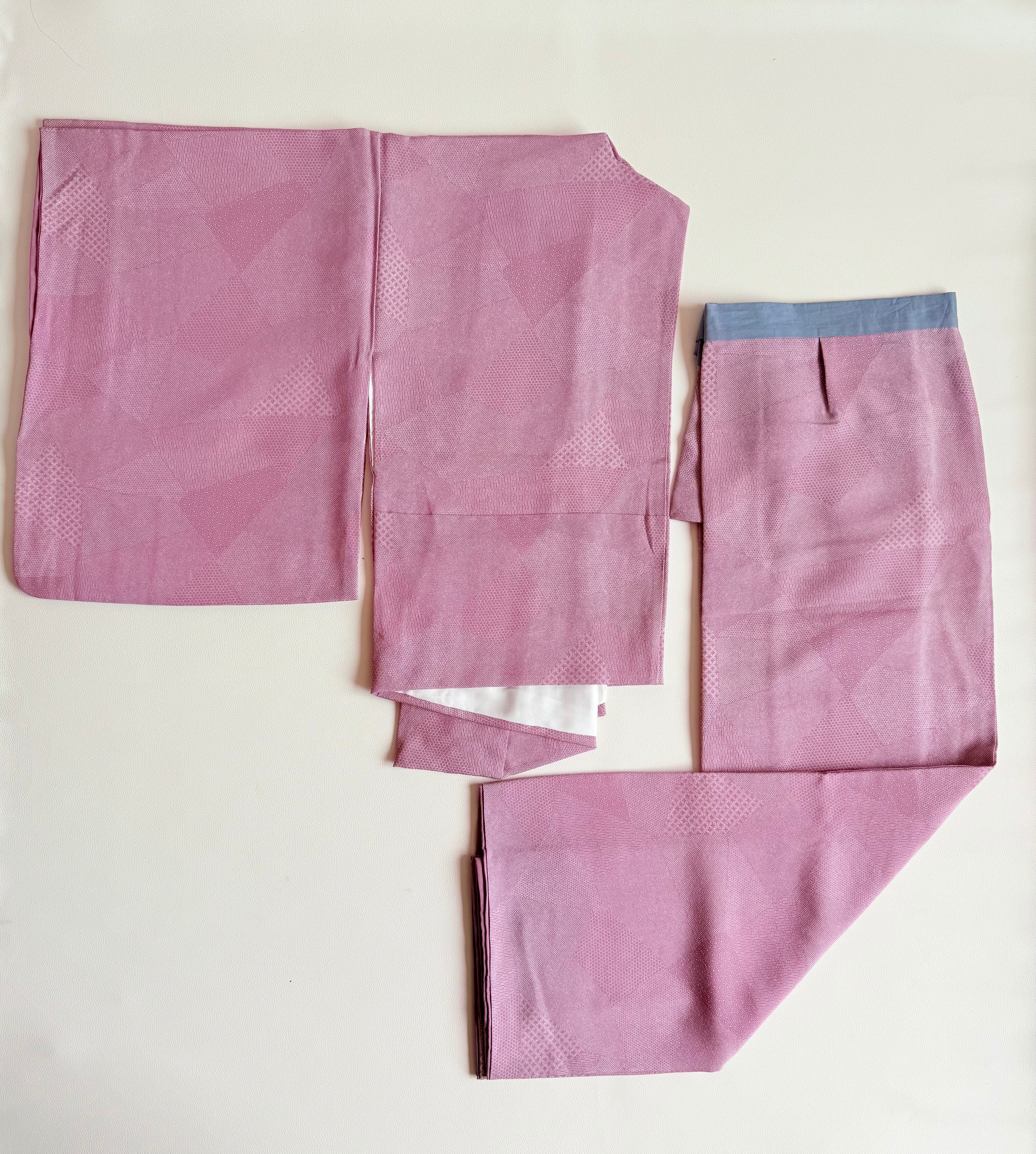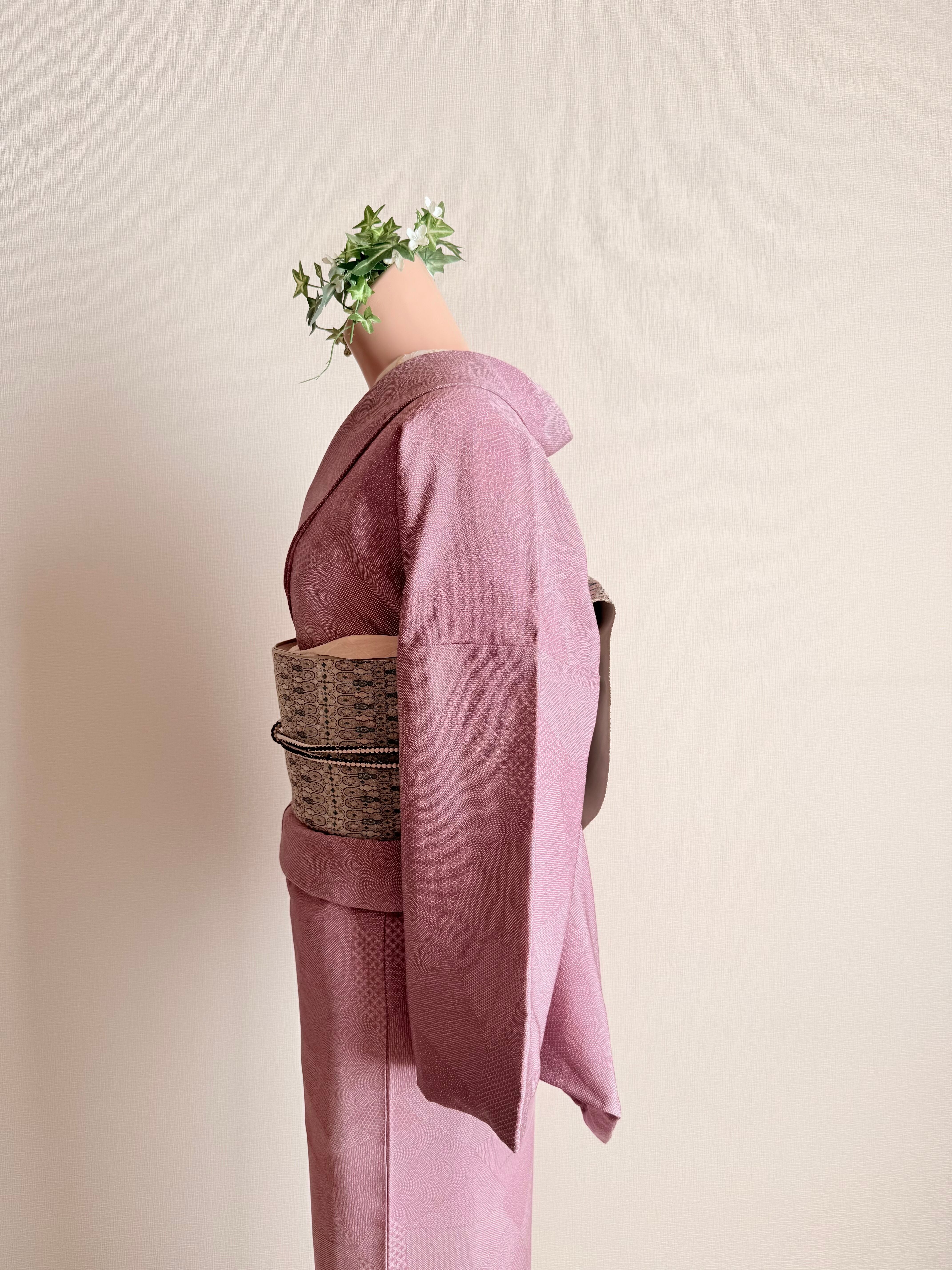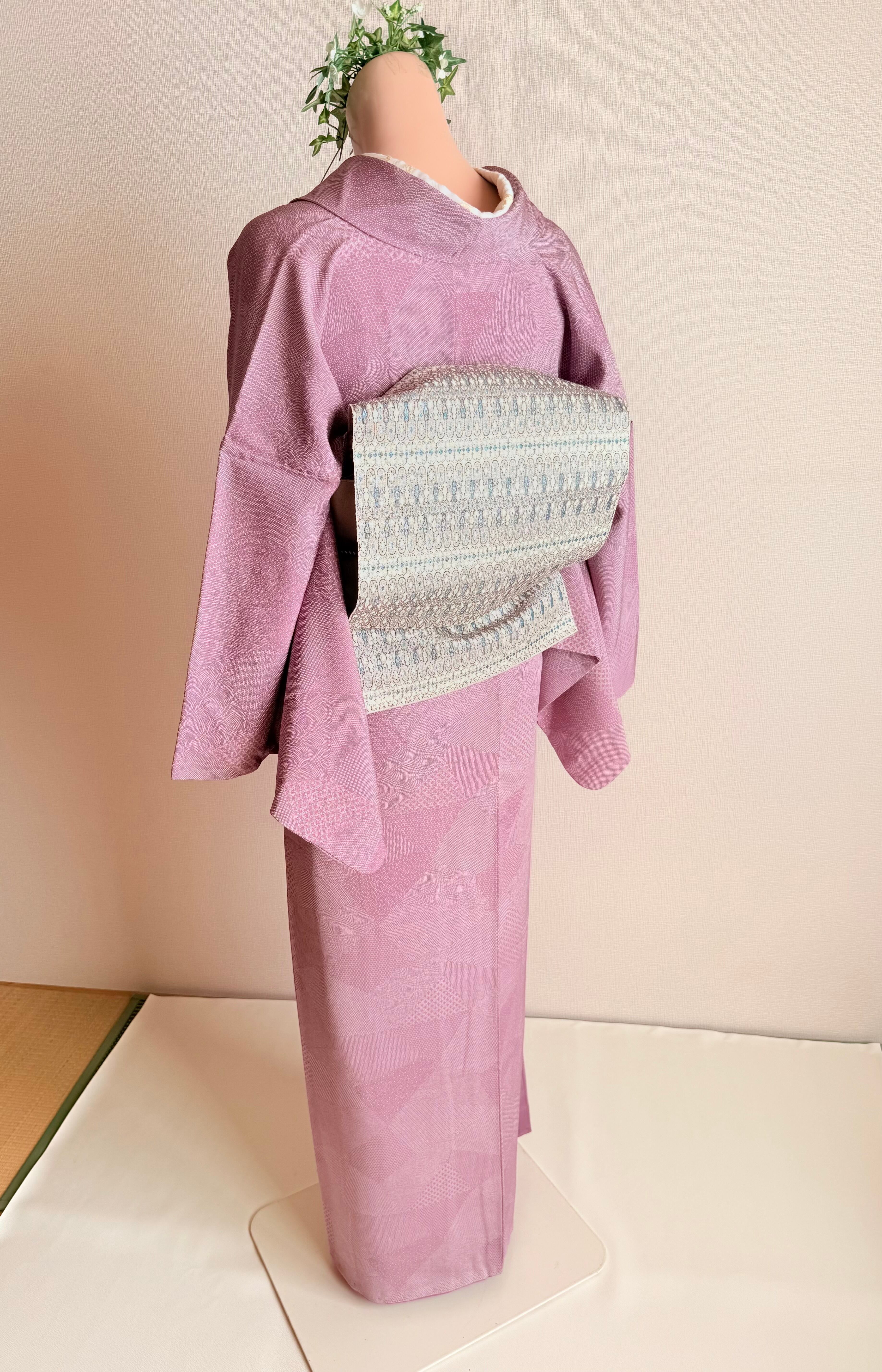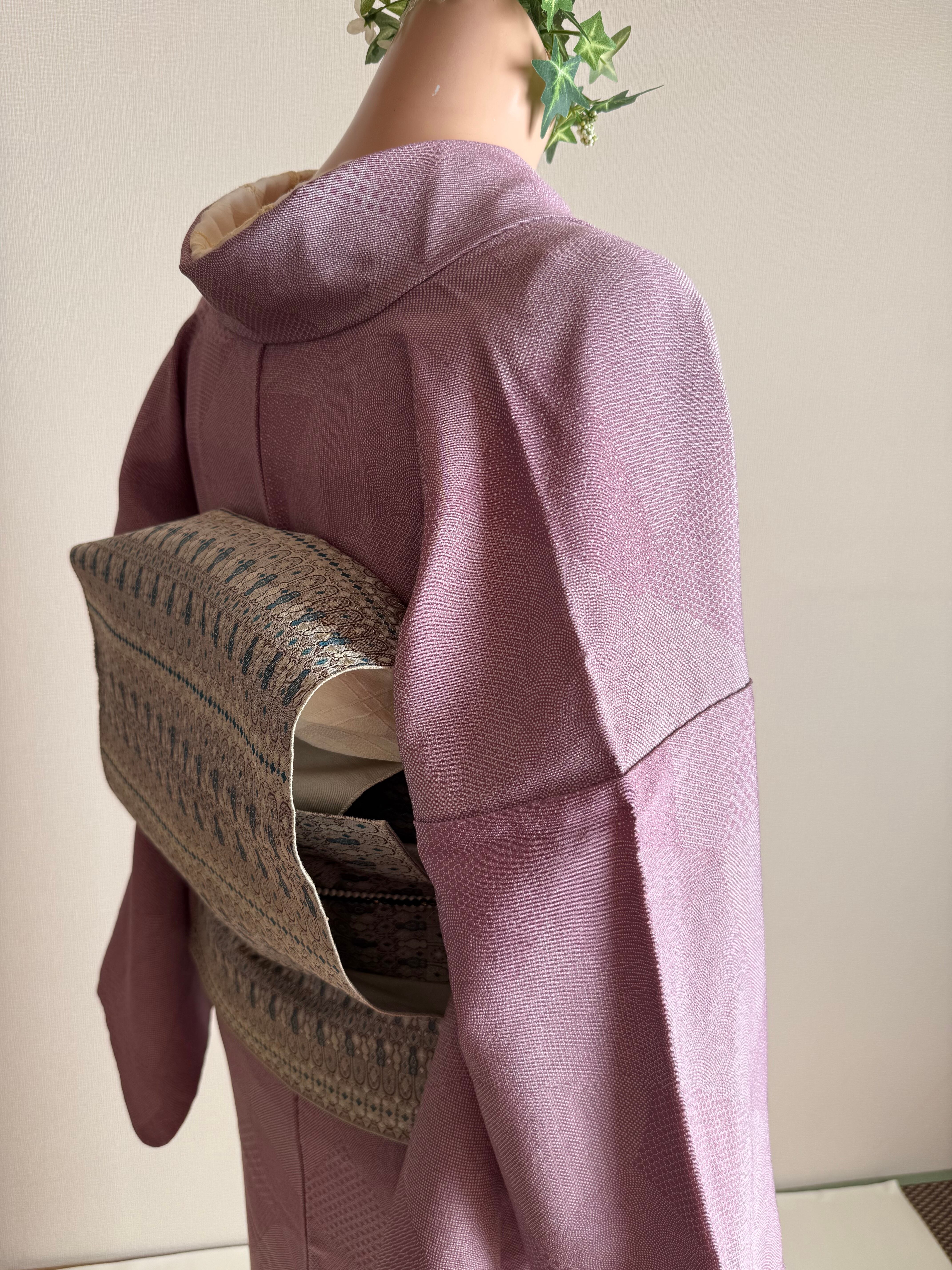 高身長で横幅サイズは標準体型の方向き。藤色の色無地風寄せ小紋のセパレート着物です。