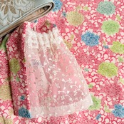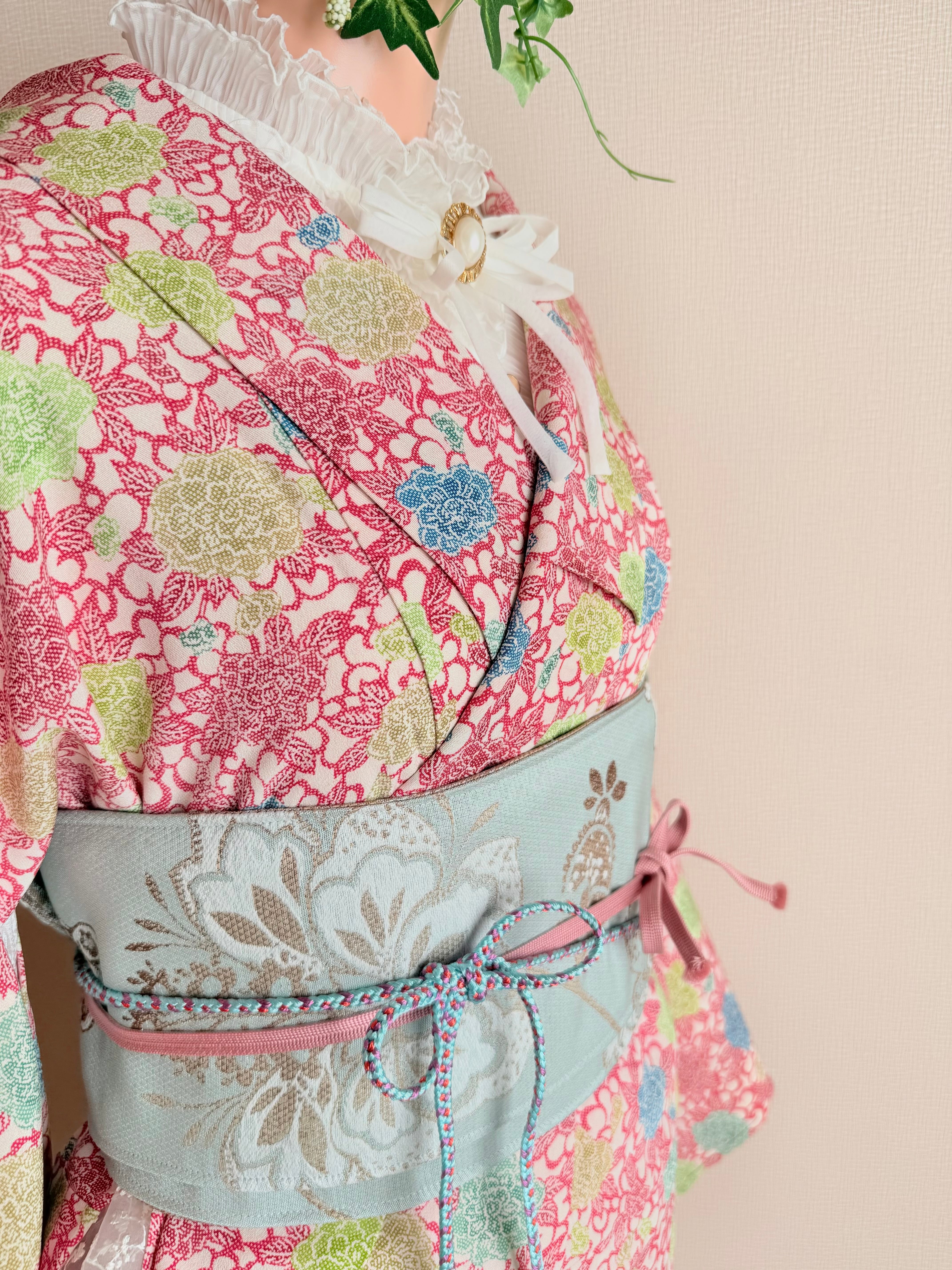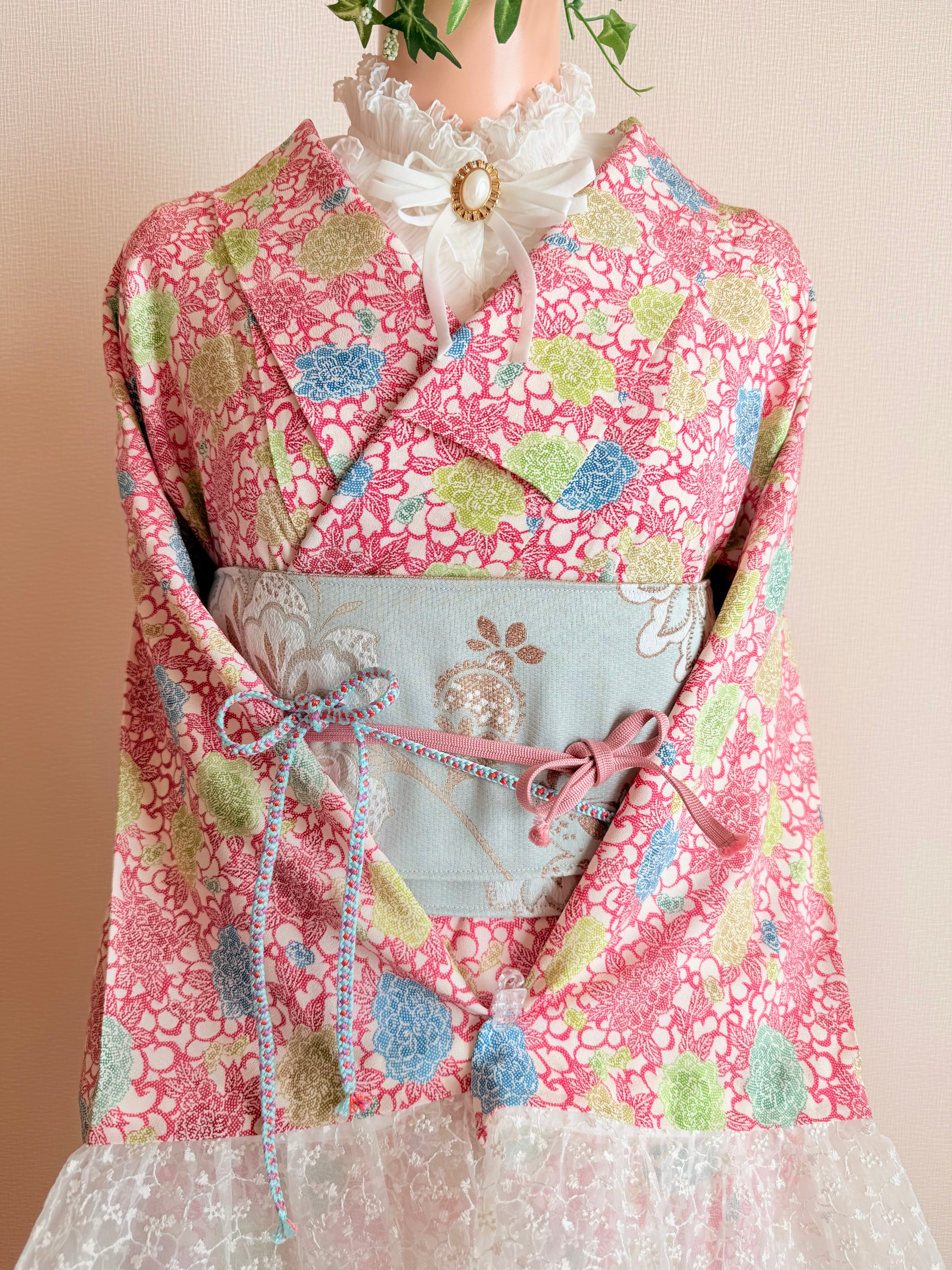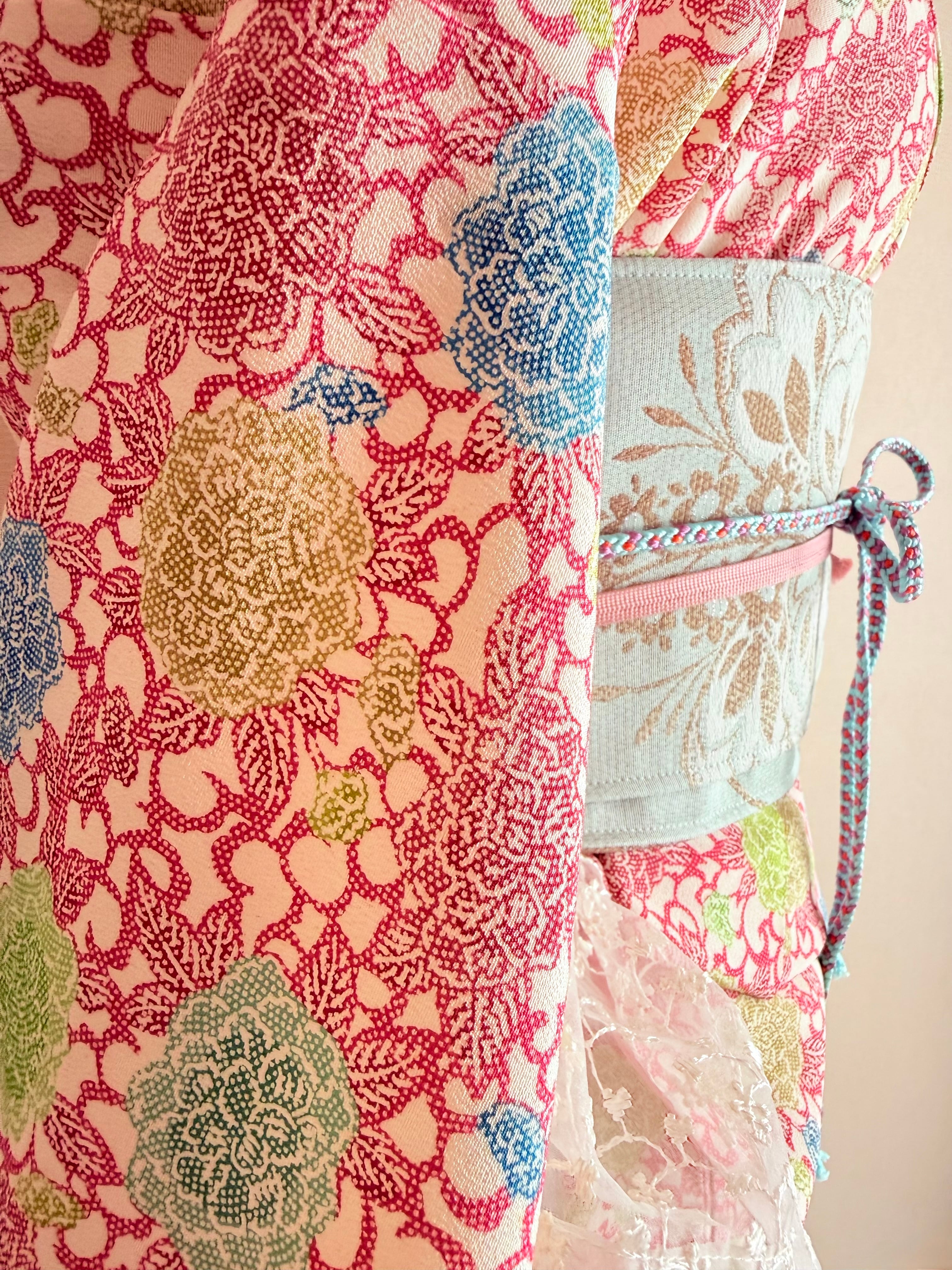 湖布アーバンモードは、洗練された洋服ミックスの着物です。どちらかといえば洋服よりで、気楽に、エレガントにさまざまなシーンで着ていただけるようデザインしました。華やかなピンク地に、レトロな花文様が散りばめられています。