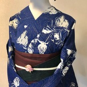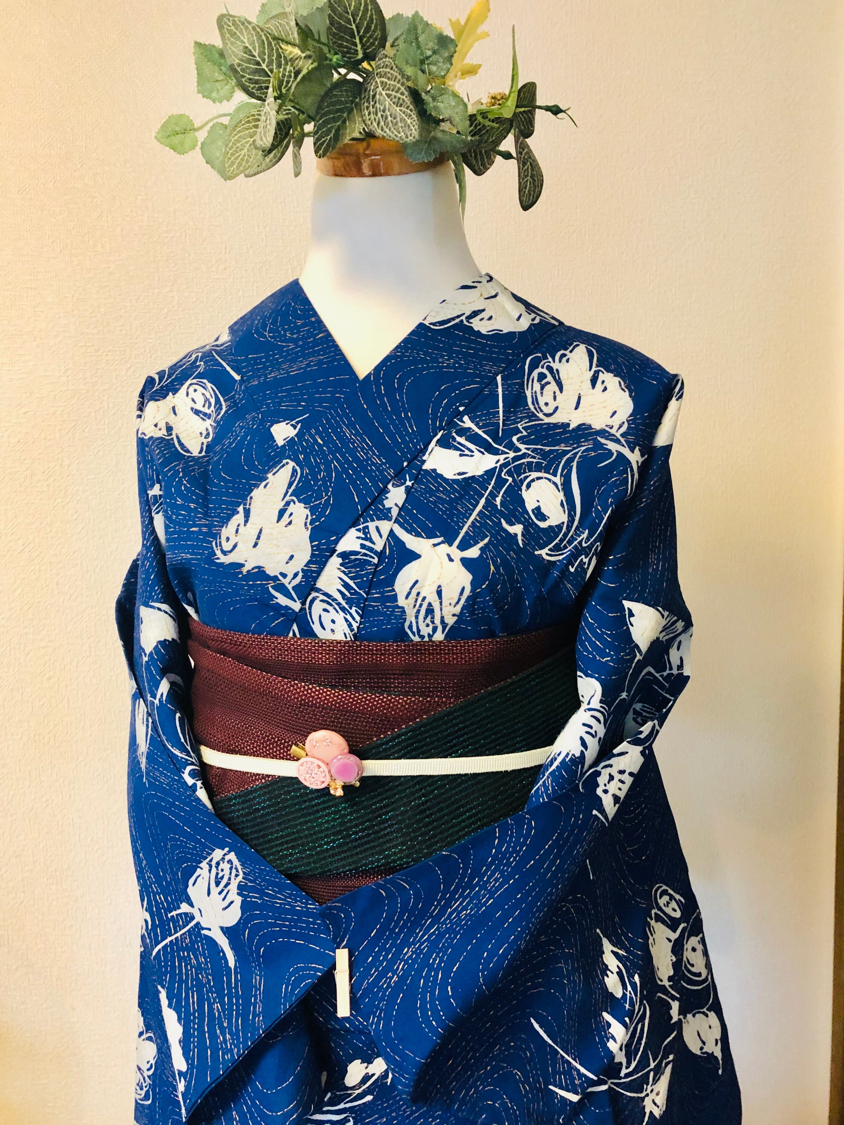 きれい目なブルーにうっすらとゴールドの曲線が入っています。その間をくぐるように薔薇が描かれていて、ゴージャスな印象の浴衣です。