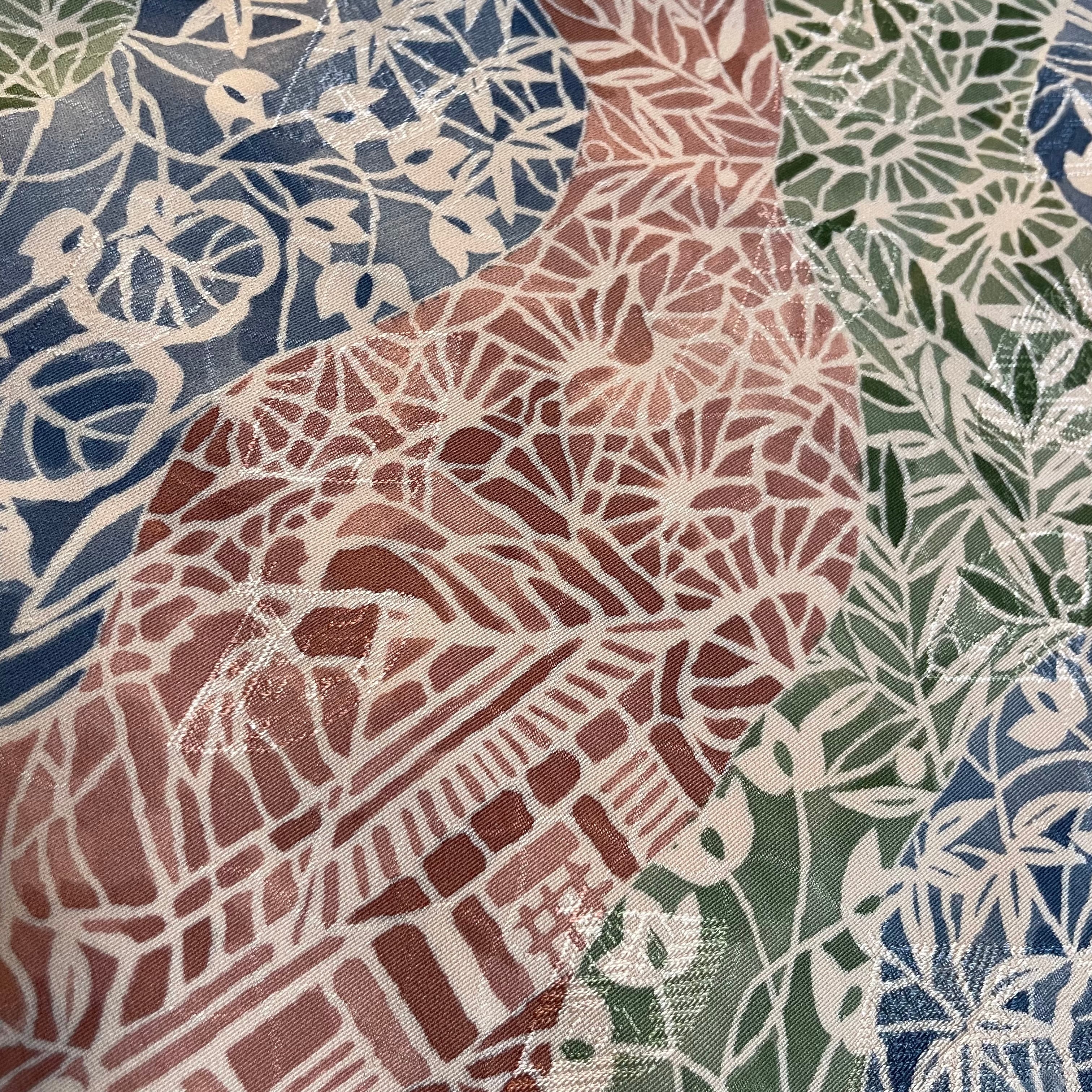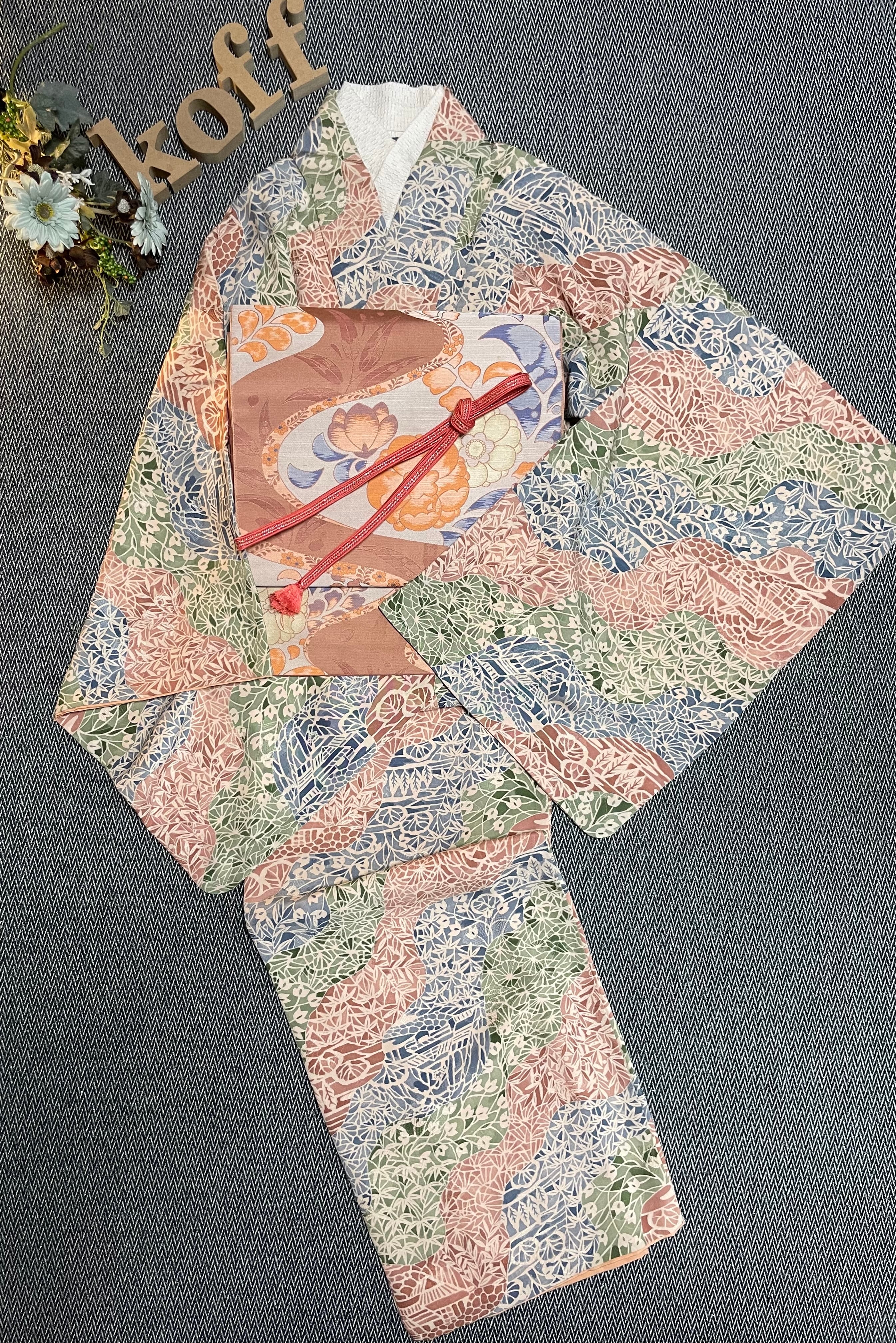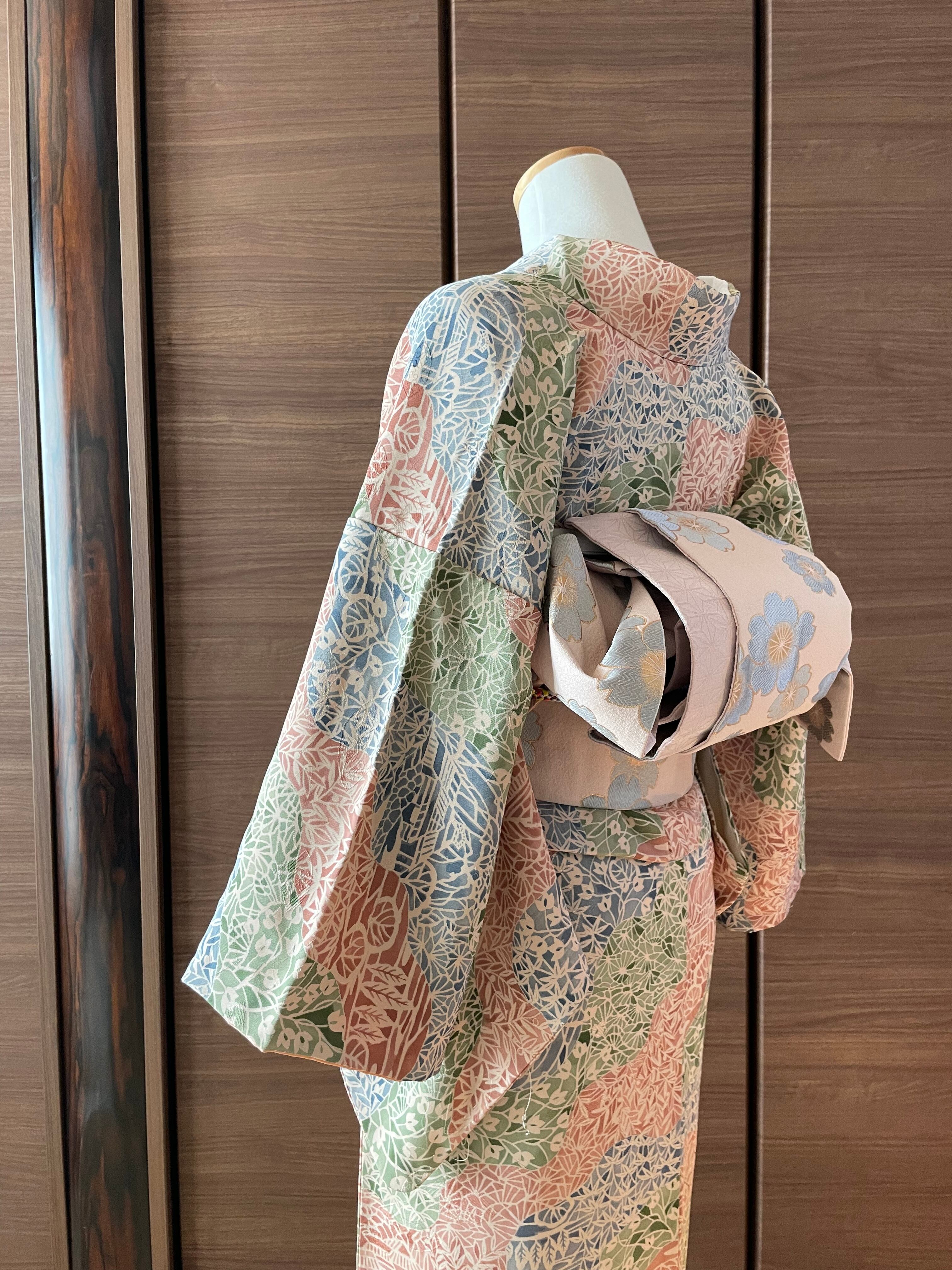 淡いピンク、ブルー、グリーンの染めにお花や風景が描かれているお洒落な小紋です。