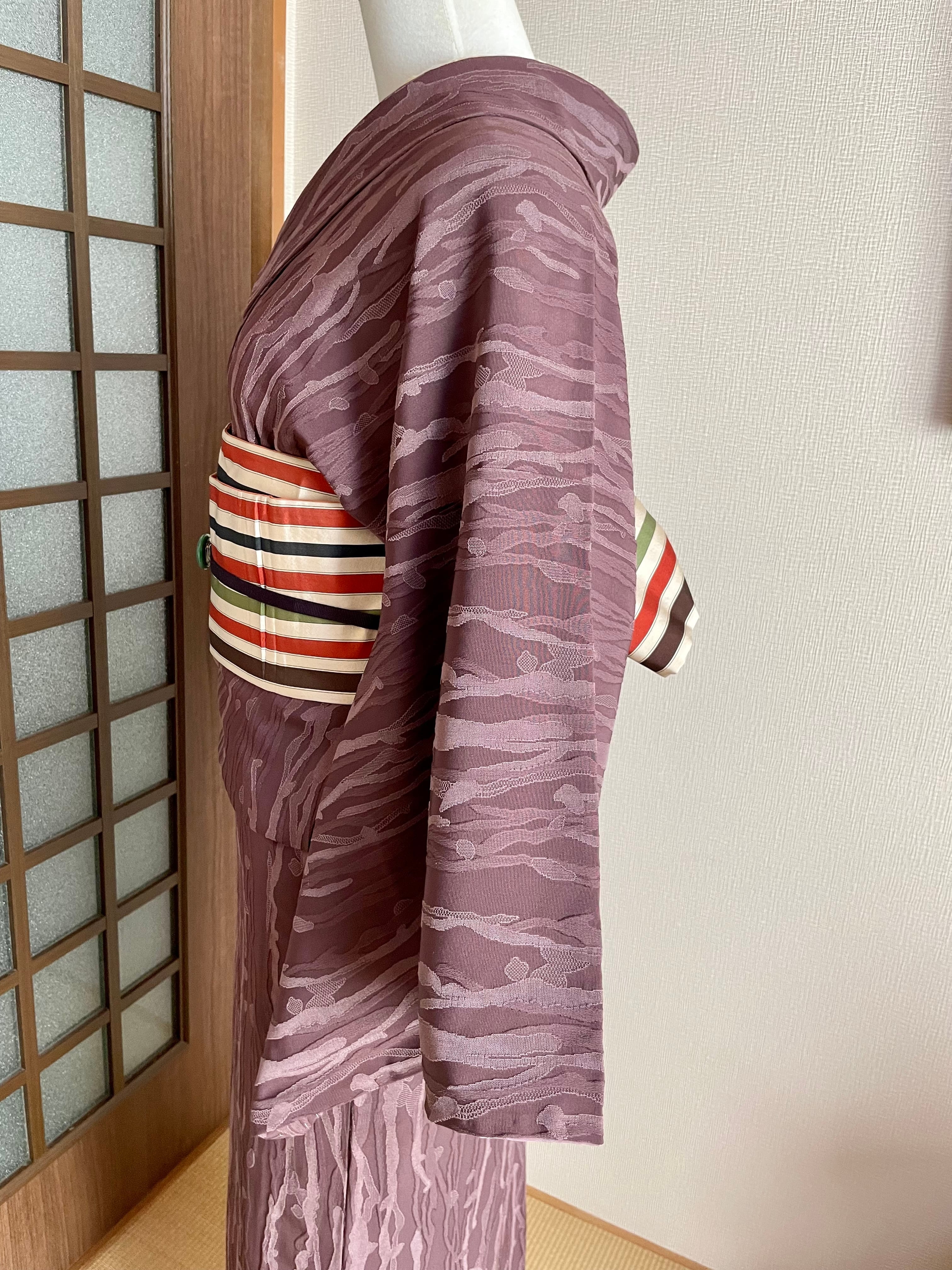 樹木の皮のような珍しい織柄が特徴の変わり織柄セパレート着物。他の誰とも被らないユニークなデザインで、お洒落度が一気にアップします。特に秋らしいグレイッシュな紫色が魅力で、季節感のある着こなしを楽しめます。