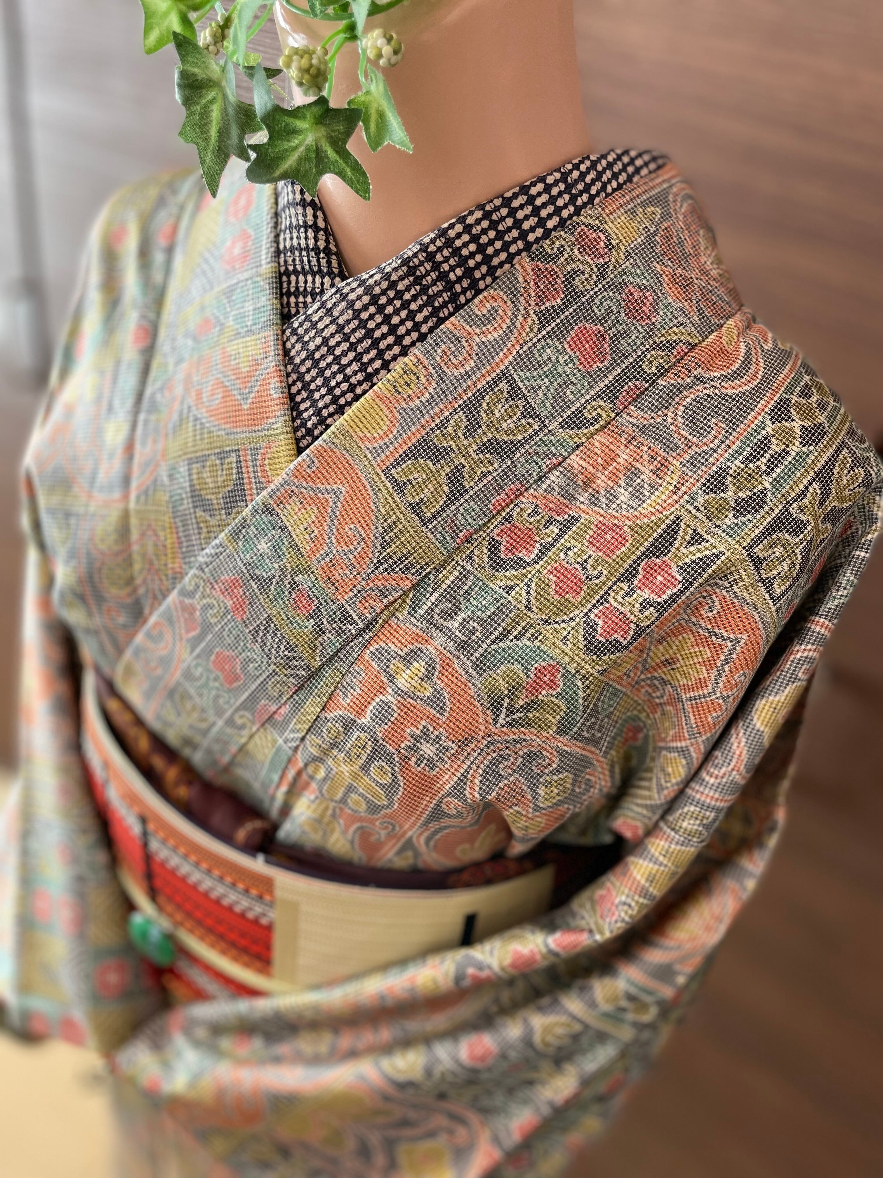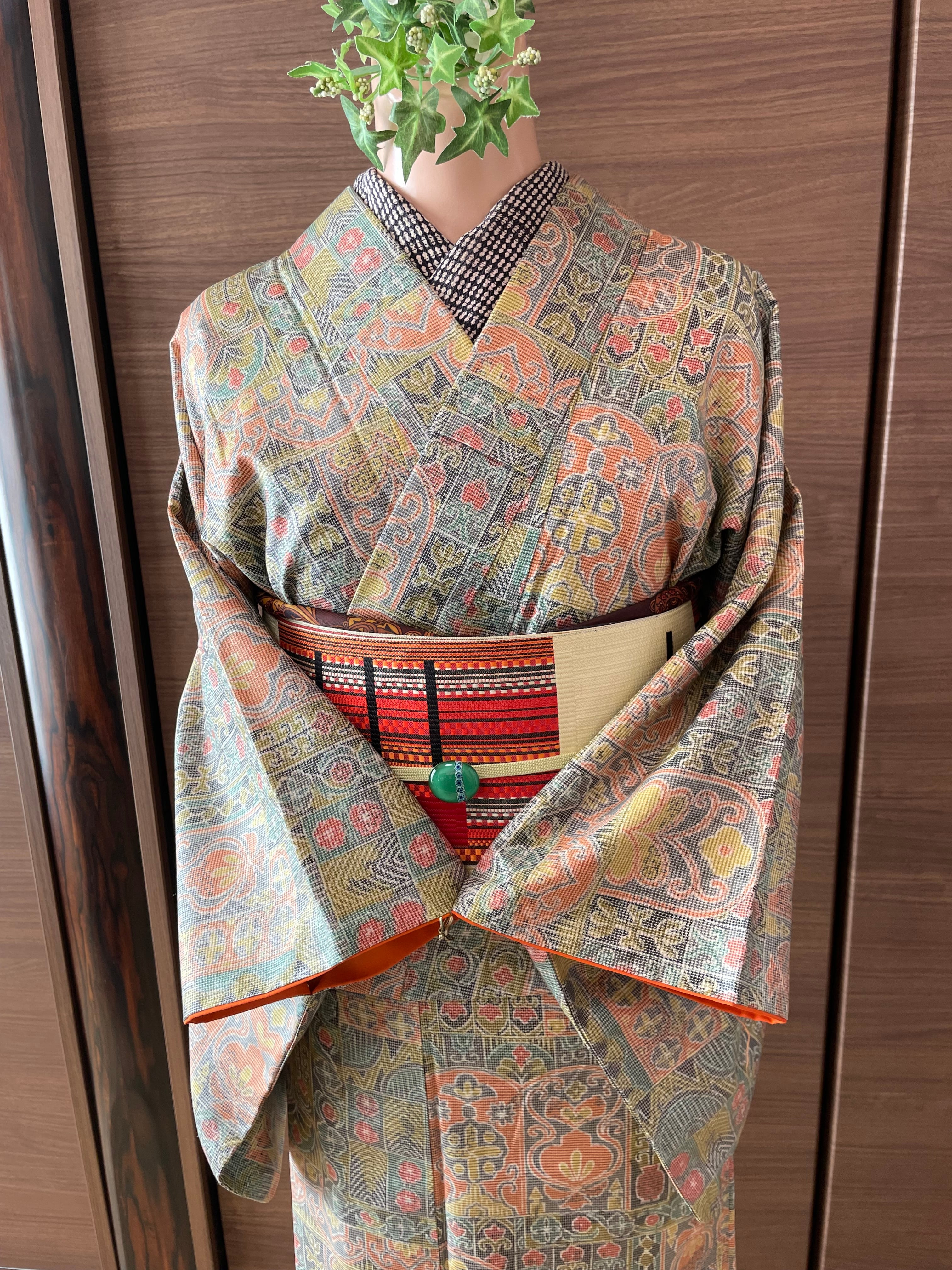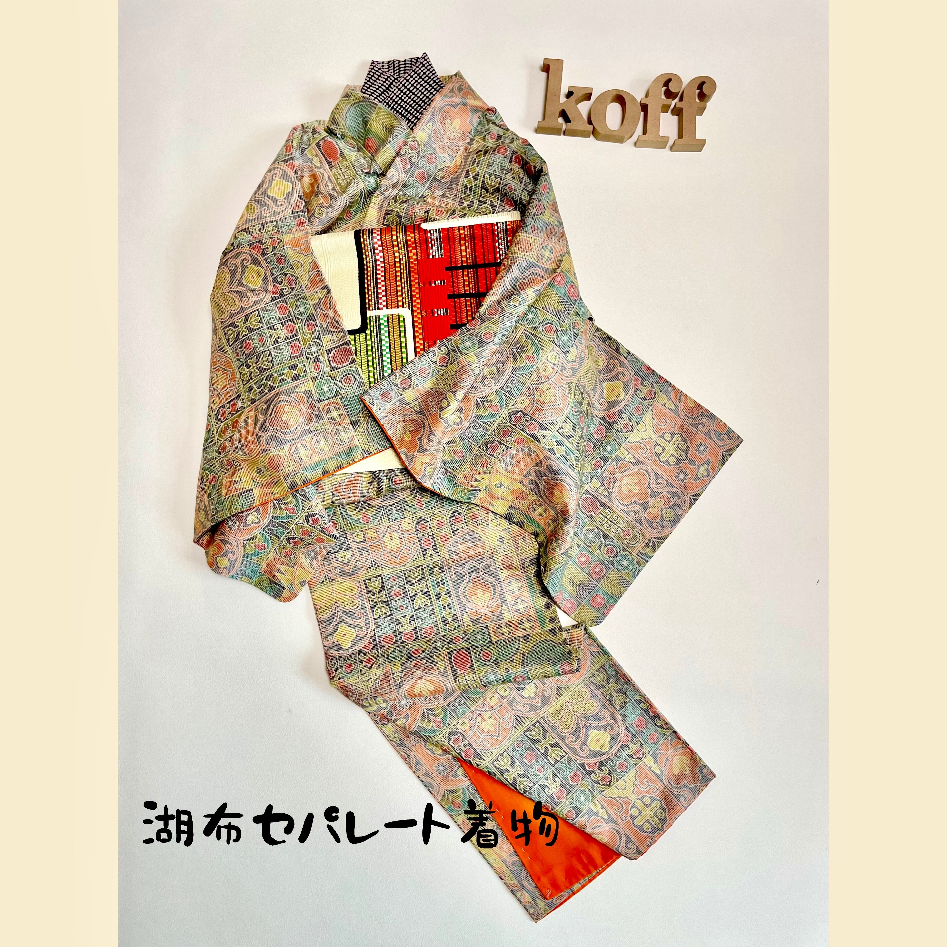 湖布では、状態のよいリサイクル着物を上下セパレートにして、着やすく、時短で着られるフレキシブルな二部式着物にして販売しています。