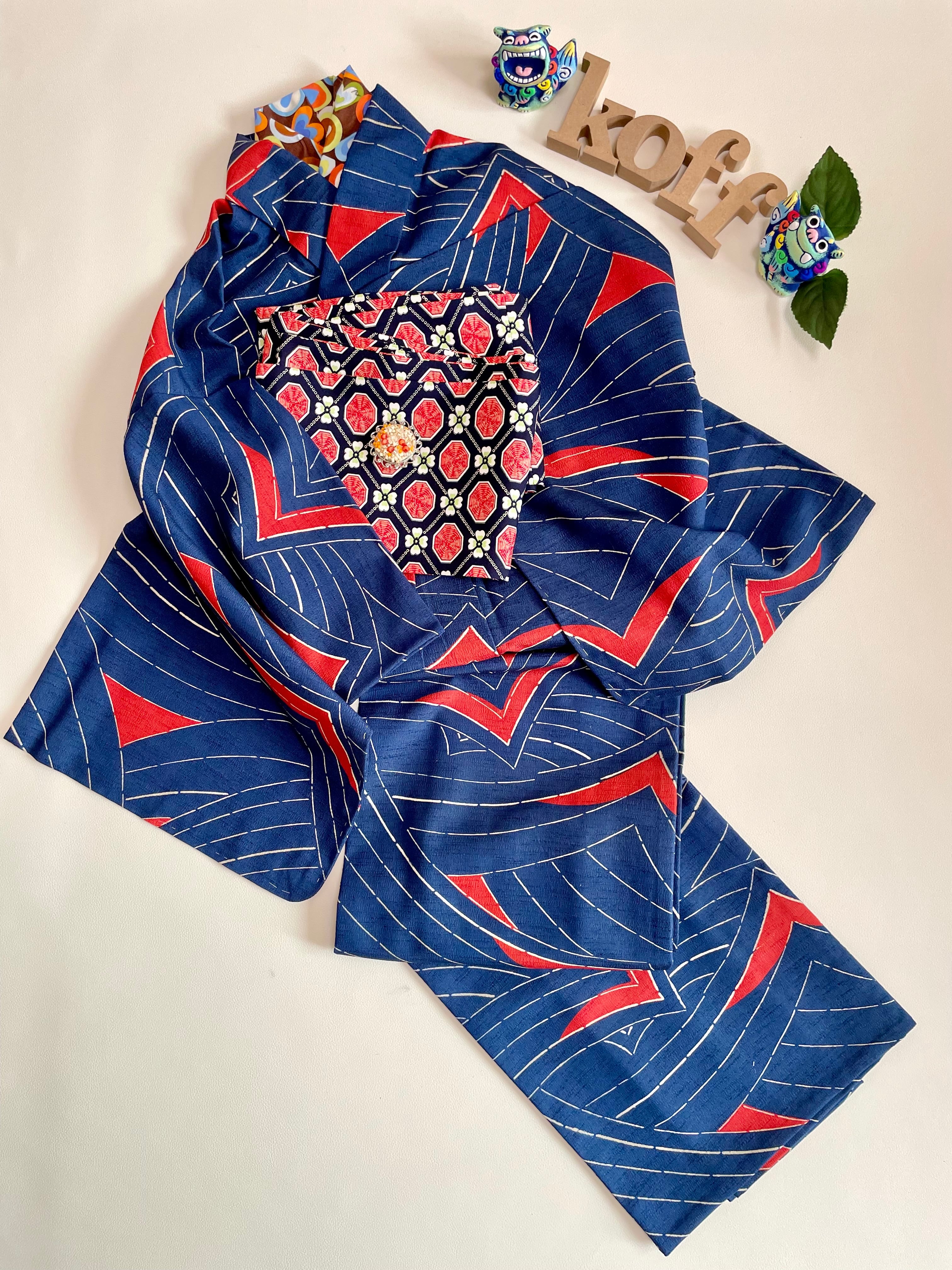 曲線柄がモダンな単衣の化繊の着物です。