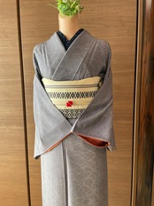 上品かつ気取らない、グレイッシュな紫色の紬小紋です。